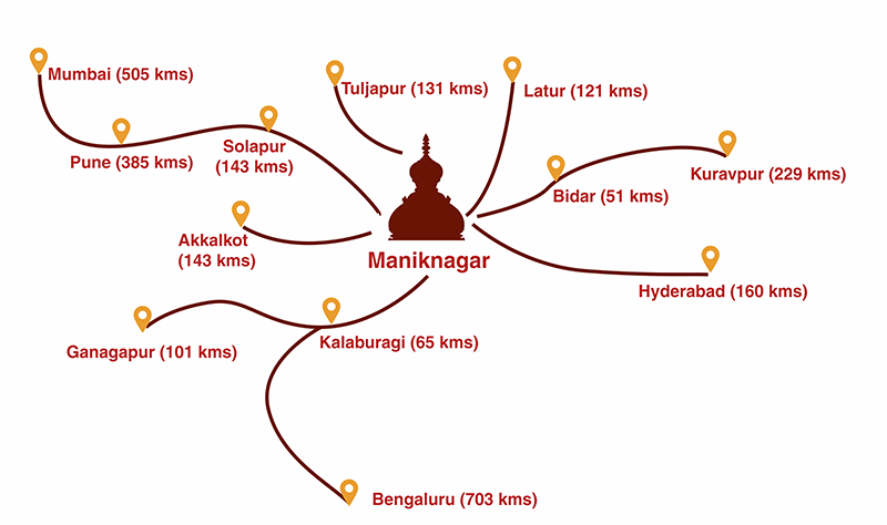 Maniknagar is a little village comprising a hamlet and a temple complex, the nucleus of which is the main temple of Shri Manik Prabhu’s Samadhi. It is located on the outskirts of Humnabad (1 k.m. away), a taluka town in the Bidar district of Karnataka. Maniknagar is situated on the slopes of high ground near the holy confluence of two little rivulets Guru-Ganga and Viraja. The climate is by and large temperate.